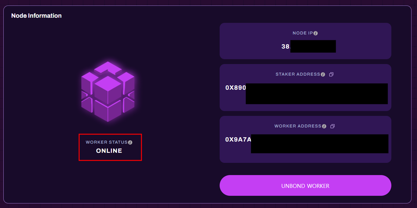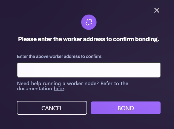 Dash board 중간의 Node Information으로 이동 → Bond Worker 클릭 → 본인의 Worker Address 입력 후 Bond 진행