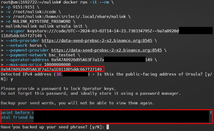 저장 후에 "Have you backed up your seed phrase?" → y 입력