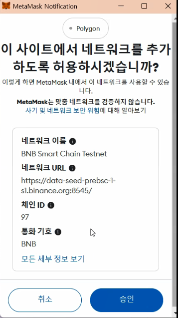 위 사이트로 이동 및 지갑 연결 및 BNB Smart Chain testnet 네트워크 추가 및 전환