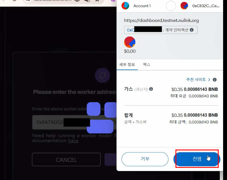 (이것 때문에 한참 헤맸네요 아효) 받은 tBNB Faucet 중에 0.1tBNB정도를 Worker address로 보내줍니다.