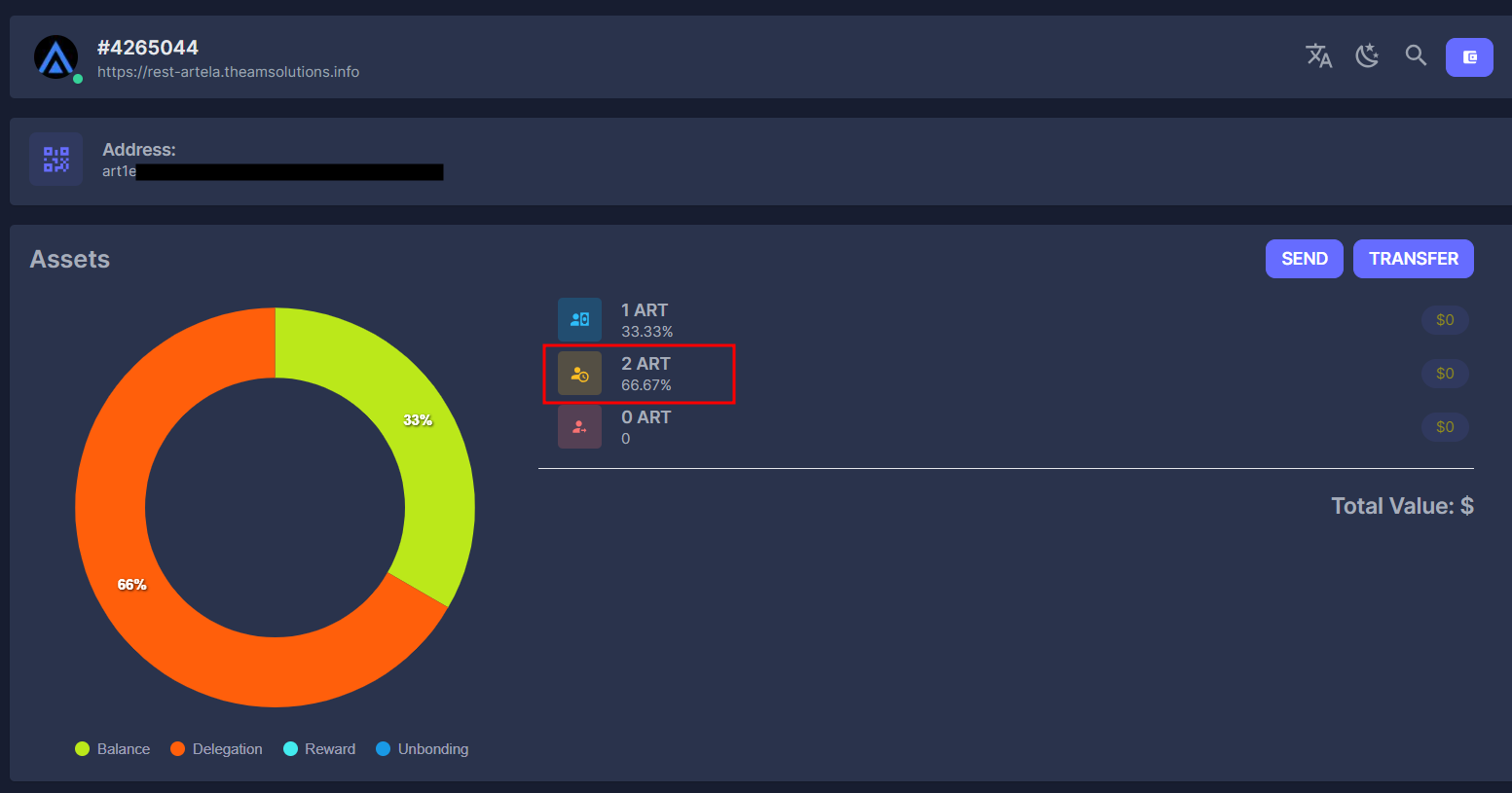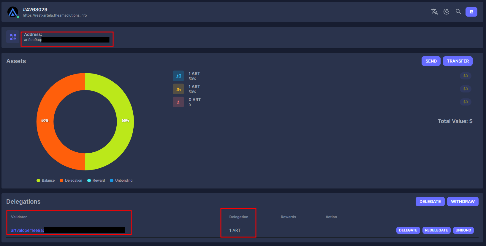 우측 상단 돋보기에서 본인의 지갑 주소를 검색하면 아래와 같이 delegation 현황이 나오게 됩니다.(art로 시작하는 주소)