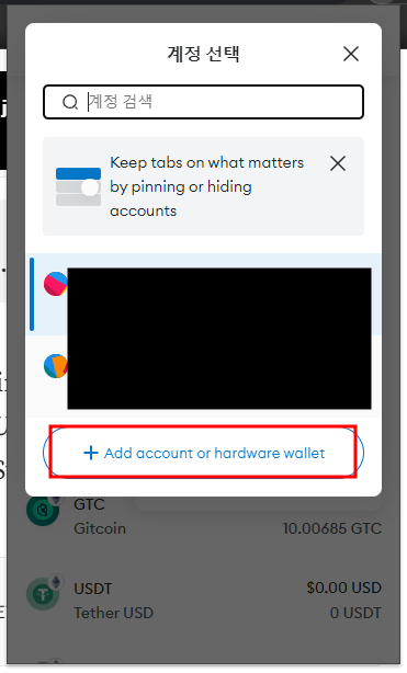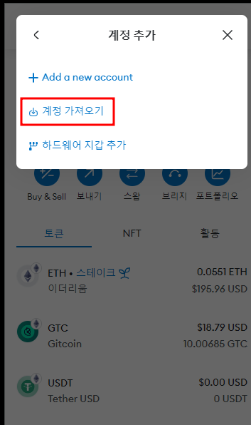 → add account or hardware wallet → 계정가져오기 → 위에서 받은 private key 앞에 0x를 붙여서 복사해 준 후 가져오기