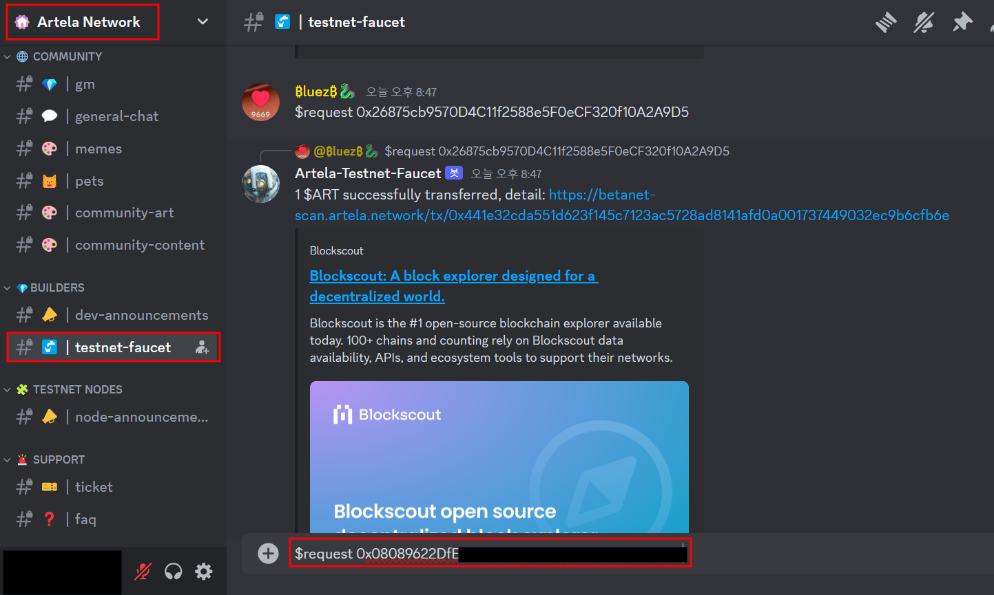13-2) Step12에서 Disocord에서 ART Faucet을 수령했었는데요, 6시간 주기로 받을 수 있는데 Block Sync가 보통 15시간 이상 걸리므로 재수령 대기시간이 지나셨을 겁니다. 추가로 다시 하나 수령해줍시다!