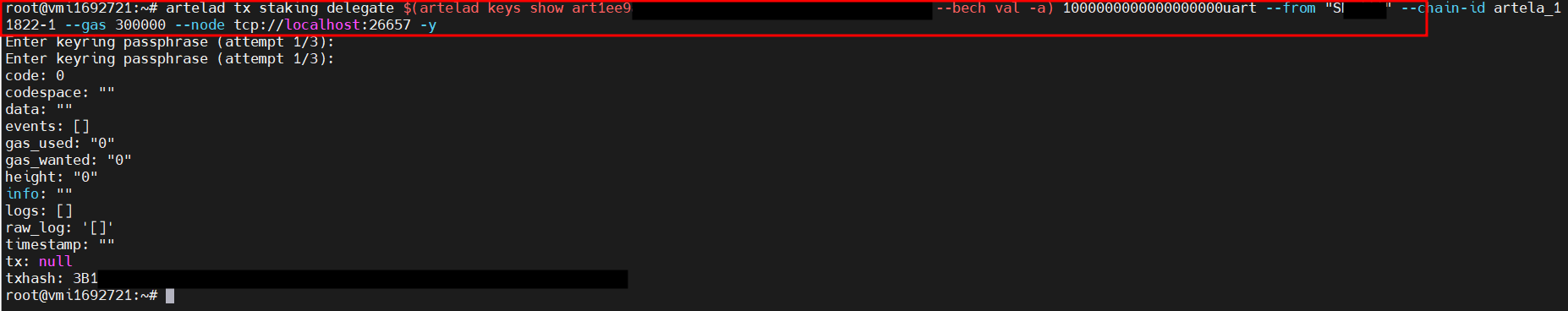 artelad tx staking delegate $(artelad keys show art1eexxxxxxxxxxxxxxxxxxxxxxxxxxxx --bech val -a) 1000000000000000000uart --from "SGxxxx" --chain-id artela_11822-1 --gas 300000 --node tcp://localhost:26657 -y