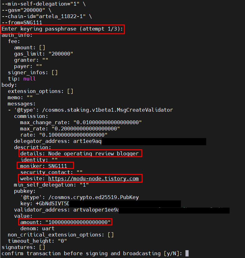 본인 비밀번호를 입력하고, confirm transaction~?이 나오면 y를 눌러줍니다.